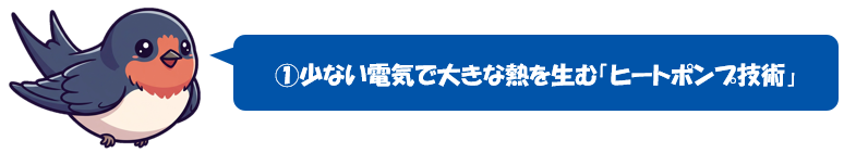 このヒートポンプ技術は、例えるなら、わずかな電気代で、外の空気中に漂っている熱をかき集めてくる仕組みです。